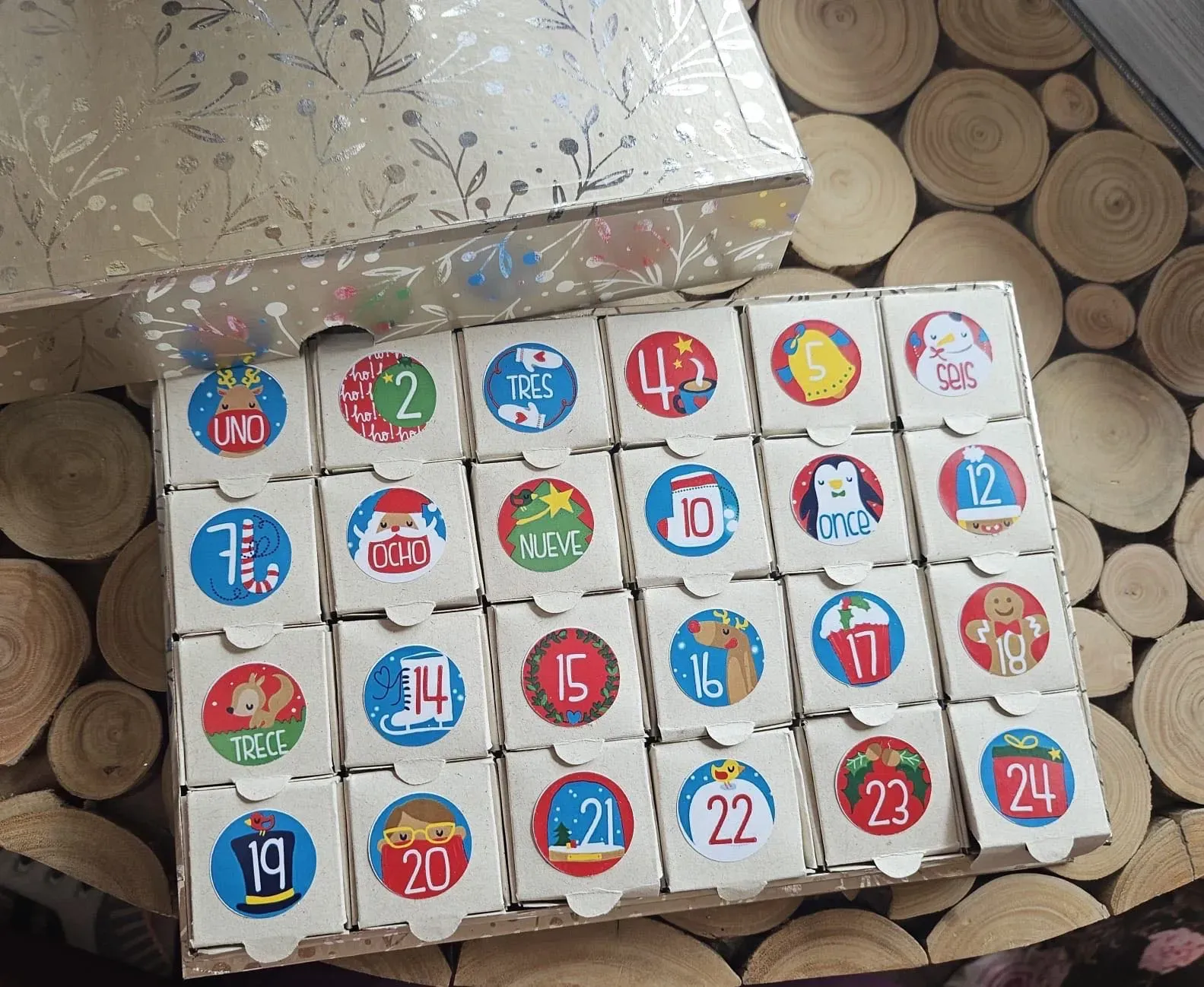 Incluye caja, y 24 figuras para colgar en el árbol de navidad. Cada día se abre una caja y aparece un adorno para el árbol.